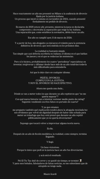 “Bir yıl önce Milano’da, İtalyan adaletinin belirlediği boşanma duruşmasına katıldım. Kasım 2024’te boşanma talebini sundum. Mart 2025’te hâkim yetkili olduğunu ilan etti ve İtalyan yasalarının gerektirdiği ayrılık süreci başladı. Bu süreç bir yıl sürdü ve 11 Mart 2026 itibarıyla tamamlandı.”
